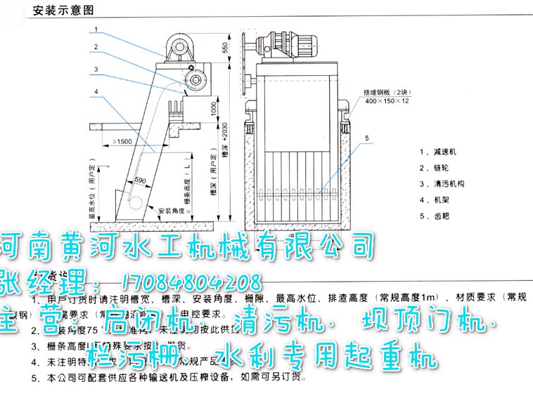 1.设备和耙齿规格:设备规格按机宽尺寸分GSLY300-3600型。机宽超过1800mm,则做成并联机。耙齿栅隙分为1mm、3mm、5mm、10mm、20mm、30mm、40mm、50mm等各种规格,选型由过水量、提升高度、固液分离总量和所分离物质的形状、颗粒大小来选择,同时选配不同的材质。